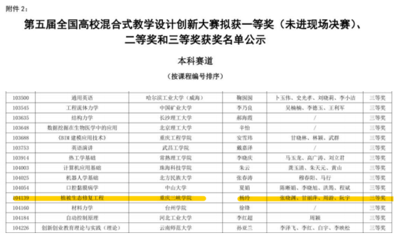 杨玲教师团队参赛的课程为《植被生态修复工程》,该课程是在学校绿色教育、创新教育和应用型转型背景下开设的专业特色课。课程依托学院科研团队关于三峡水库消落带植被生态修复研究成果,开展混合式创新教学设计。3年的混合式教学始终以学生为主体,学生无论是综合成绩,还是专业技能、综合素质都得到有效提升。《植被生态修复工程》课程也于2023年荣获第五届全国高校混合式教学设计创新大赛三等奖,并立项为2023年重庆市一流课程。