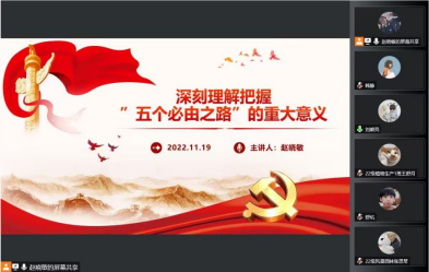 活动开始,赵晓敏同志从“五个必由之路”的提出时间和背景开始讲述,并详细学习了“五个必由之路”的五大重要内容;通过视频学习了解到习近平总书记在党的二十大报告中要求全党必须牢记“五个必由之路”,强调这是在长期实践中得出的至关紧要的规律性认识,必须倍加珍惜、始终坚持,咬定青山不放松。会后,同学们积极分享学习感悟,纷纷表示通过今天的学习深刻理解了党团结带领中国人民积累了宝贵经验和精神财富,也坚定了不忘初心、牢记使命的理想信念。