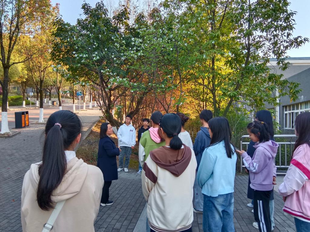在阮宇老师的带领下,大家从明辨楼1栋出发,沿着梧桐大道向海棠苑绕行。阮宇老师在途中向大家介绍了各种植物的科属、学名,并且教授大家如何分辨各种食用型植物。在讲解过程中,阮老师寓教于乐,分享了自己的见闻与趣事,激发了同学们的学习兴趣。