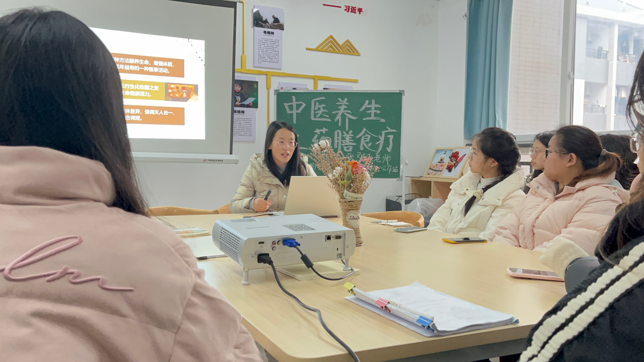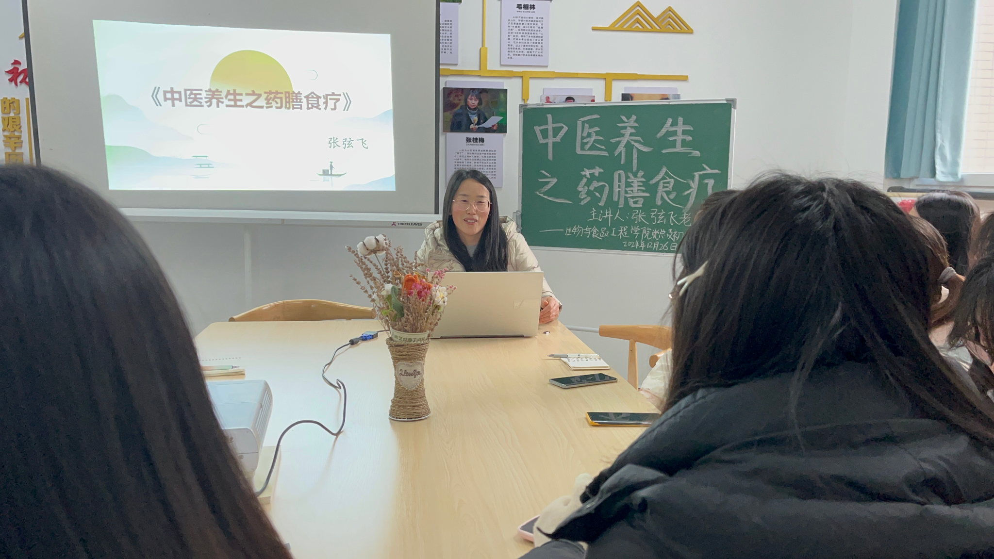 张弦飞老师首先对中医养生进行了简要概述,深入讲解了中医药膳食疗的理论基础和应用。她指出,药膳是在中医学、烹饪学和营养学理论指导下,将中药与具有药用价值的食物相配,采用独特的饮食烹调技术和现代科学方法制作而成的美味食品。药膳“寓医于食”,具有调理身体、预防疾病的功效,展现出中医养生的独特魅力。张老师还根据自身经历分享多个关于药膳食疗的现实案例,展示了其在日常生活中的实际应用效果,强调了中医养生与现代生活的紧密联系,鼓励大学生们将中医养生理念融入到日常生活中,通过合理的饮食、适量的运动等方式来维护自身健康。
