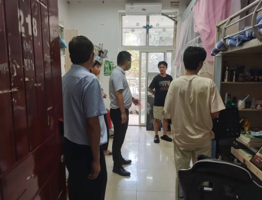在学校对疫情防控特殊时期总体部署下,为贯彻落实学校疫情防控工作会议精神及有关要求,了解关心学生在宿舍的学习生活状态,9月5日下午,我院党总支书记骆孟鑫、副书记陈文剑带领全体辅导员深入走访学生宿舍。