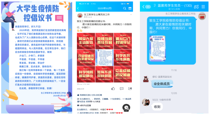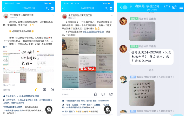 2020年02月05日,生工学院学生公寓党员工作站通过官方QQ线上发布“大学生疫情防控倡议书”并开展线上“手动加油接力”活动。旨在呼吁大家积极响应国家号召,共同抵御疫情的同时,致敬奋战在一线的工作者们,为“抗疫行动”加油。